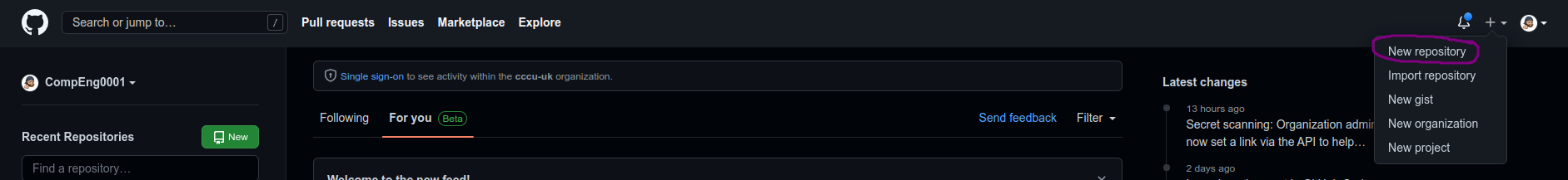 To create a new repo on GitHub, log in and go to the GitHub home page. You can find the “New repository” option under the “+” sign next to your profile picture, in the top right corner of the navbar: