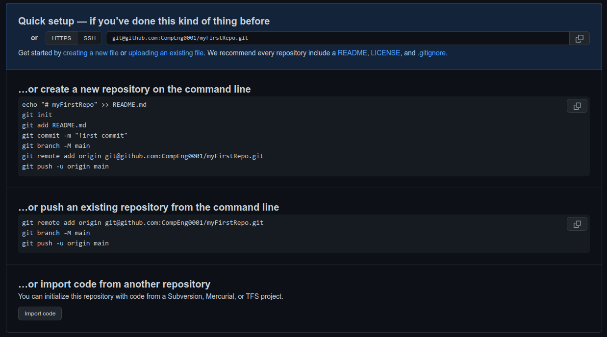Total 0 (delta 0), reused 0 (delta 0), pack-reused 0 remote: remote: Create a pull request for 'main' on GitHub by visiting: remote: https://github.com/CompEng0001/myFirstRepo/pull/new/main remote: To github.com:CompEng0001/myFirstRepo.git * [new branch] main -> main branch 'main' set up to track 'origin/main'.You might be wondering what that "origin" word means in the command above. What happens is that when you clone a remote repository to your local machine, git creates an alias for you. In nearly all cases this alias is called "origin." It's essentially shorthand for the remote repository's URL. So, to push your changes to the remote repository, you could've used either the command: