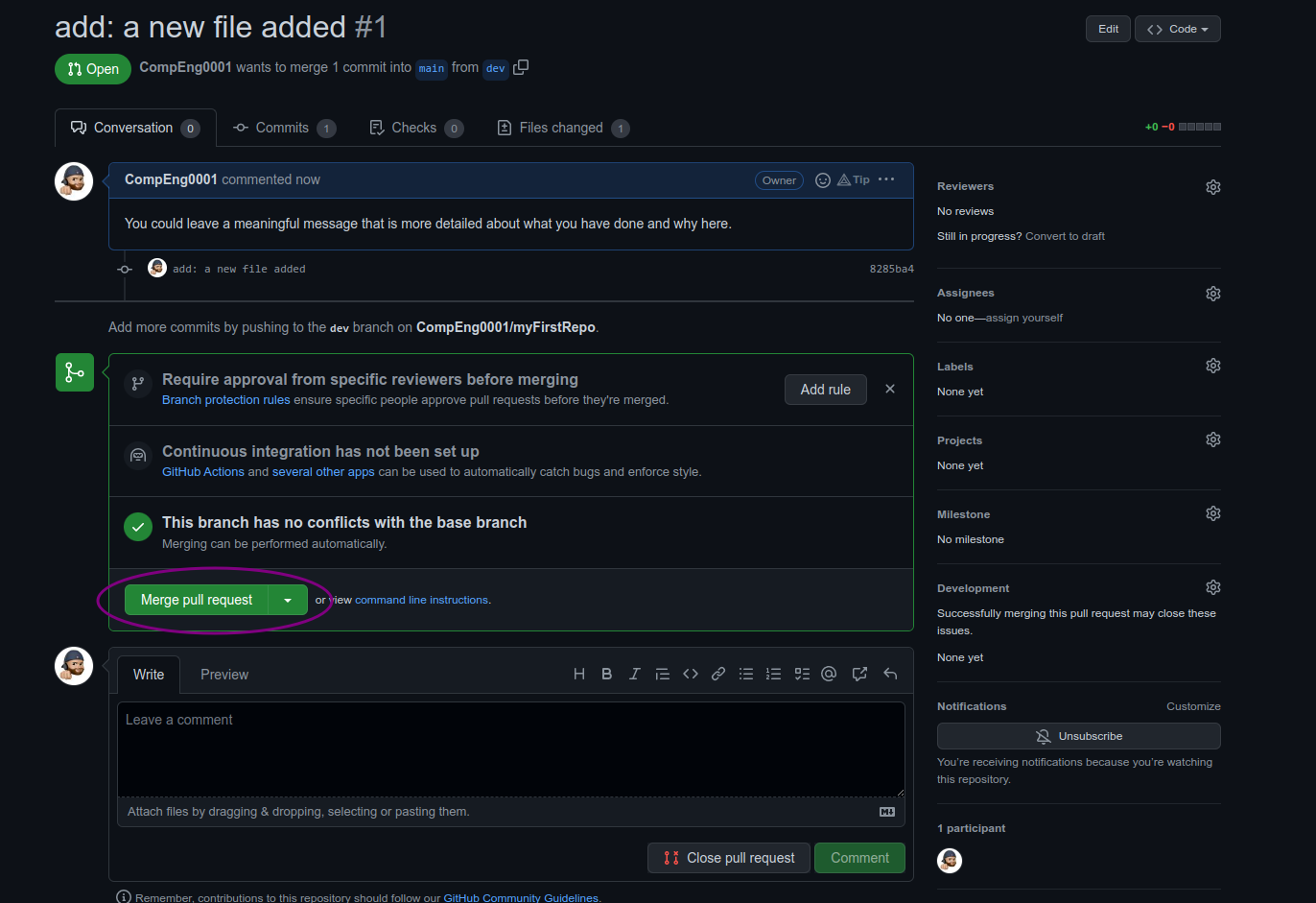 git logcommand again to see all new commits.commit bc64b101b966bcee5f8b87c451b674450638d981 (HEAD -> main, origin/main) Merge: f2e1069 8285ba4 Author: CompEng0001 <40290417+CompEng0001@users.noreply.github.com> Date: Sat Nov 5 12:46:32 2022 +0000 Merge pull request #1 from CompEng0001/dev add: a new file added commit 8285ba429f3ab757e8549416b33dde454e563e09 (dev) Author: CompEng0001 <sb1501@canterbury.ac.uk> Date: Sat Nov 5 12:39:27 2022 +0000 add: a new file added commit f2e1069137b6bc0115e119b3aae83c35cc1d0358 Author: CompEng0001 <sb1501@canterbury.ac.uk> Date: Sat Nov 5 11:52:16 2022 +0000 init: This is my first commit -