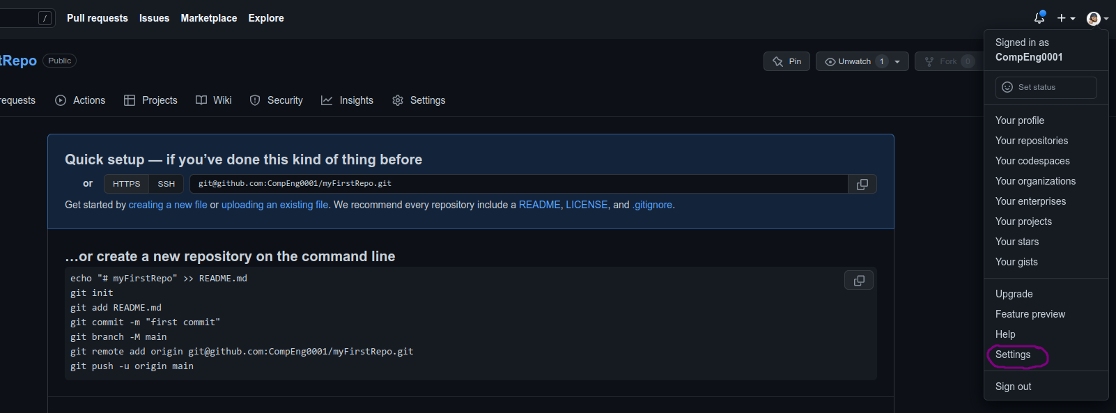 You will see your new repo has been created with some useful instructions on creating and pushing a repo.