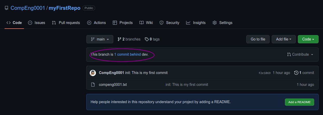git pull origin maincommand(when working on the primary branch). In most cases, this can be shortened togit pull.remote: Enumerating objects: 2, done. remote: Counting objects: 100% (2/2), done. remote: Compressing objects: 100% (2/2), done. Unpacking objects: 100% (2/2), 1.20 KiB | 1.21 MiB/s, done. remote: Total 2 (delta 0), reused 0 (delta 0), pack-reused 0 From github.com:CompEng0001/myFirstRepo f2e1069..bc64b10 main -> origin/main 8285ba4..bfdc77f dev -> origin/dev Updating f2e1069..bc64b10 Fast-forward anewfile.txt | 0 1 file changed, 0 insertions(+), 0 deletions(-) create mode 100644 anewfile.txt -