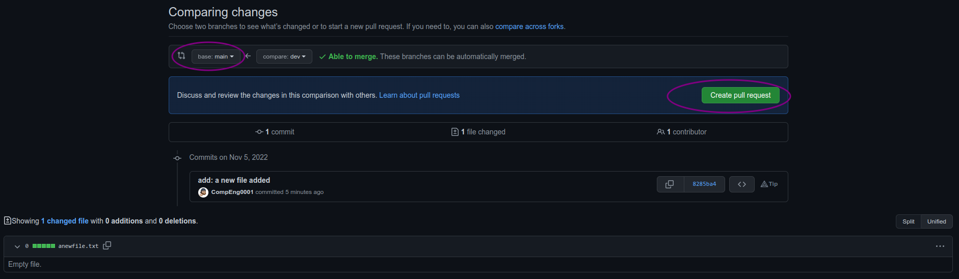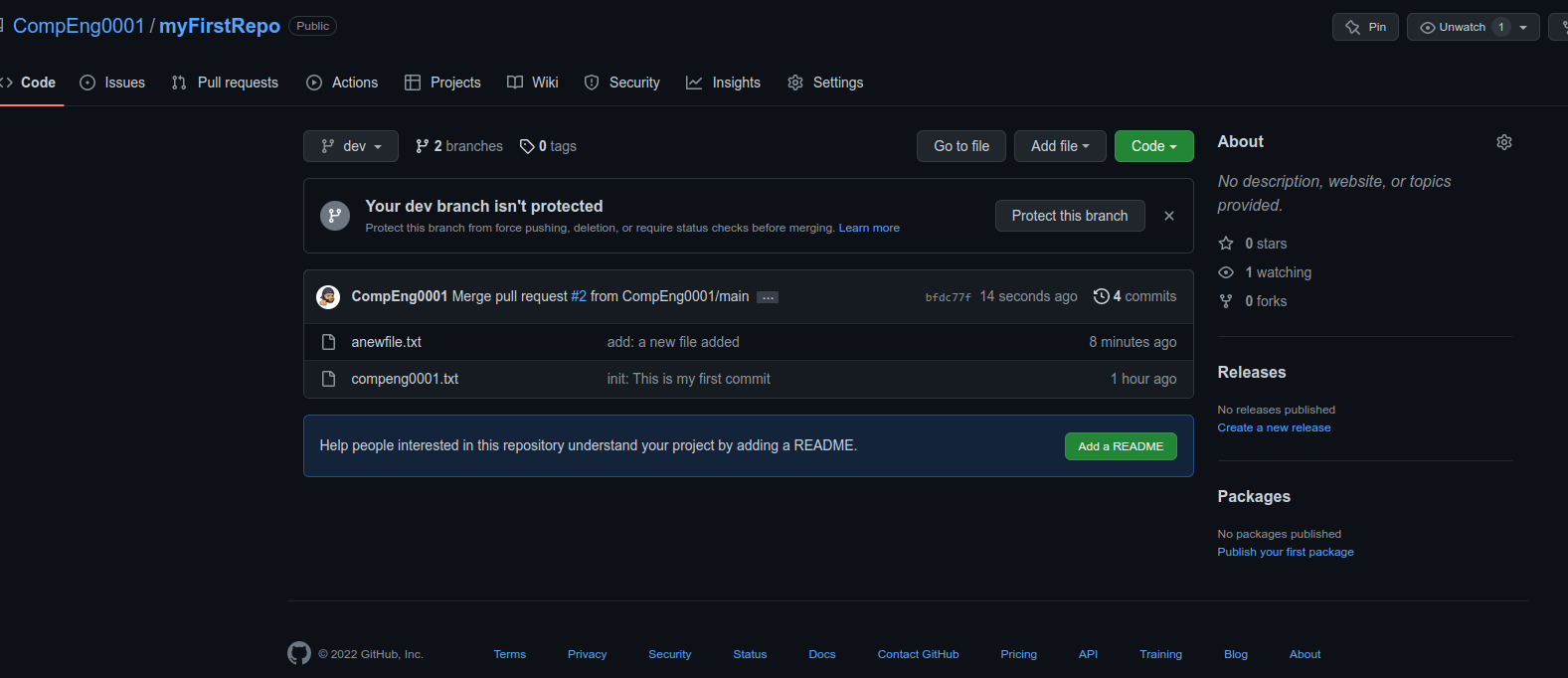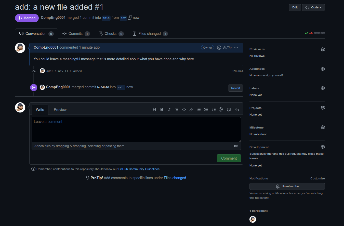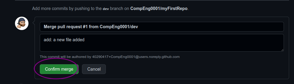 git logcommand again to see all new commits.commit bc64b101b966bcee5f8b87c451b674450638d981 (HEAD -> main, origin/main) Merge: f2e1069 8285ba4 Author: CompEng0001 <40290417+CompEng0001@users.noreply.github.com> Date: Sat Nov 5 12:46:32 2022 +0000 Merge pull request #1 from CompEng0001/dev add: a new file added commit 8285ba429f3ab757e8549416b33dde454e563e09 (dev) Author: CompEng0001 <sb1501@canterbury.ac.uk> Date: Sat Nov 5 12:39:27 2022 +0000 add: a new file added commit f2e1069137b6bc0115e119b3aae83c35cc1d0358 Author: CompEng0001 <sb1501@canterbury.ac.uk> Date: Sat Nov 5 11:52:16 2022 +0000 init: This is my first commit -