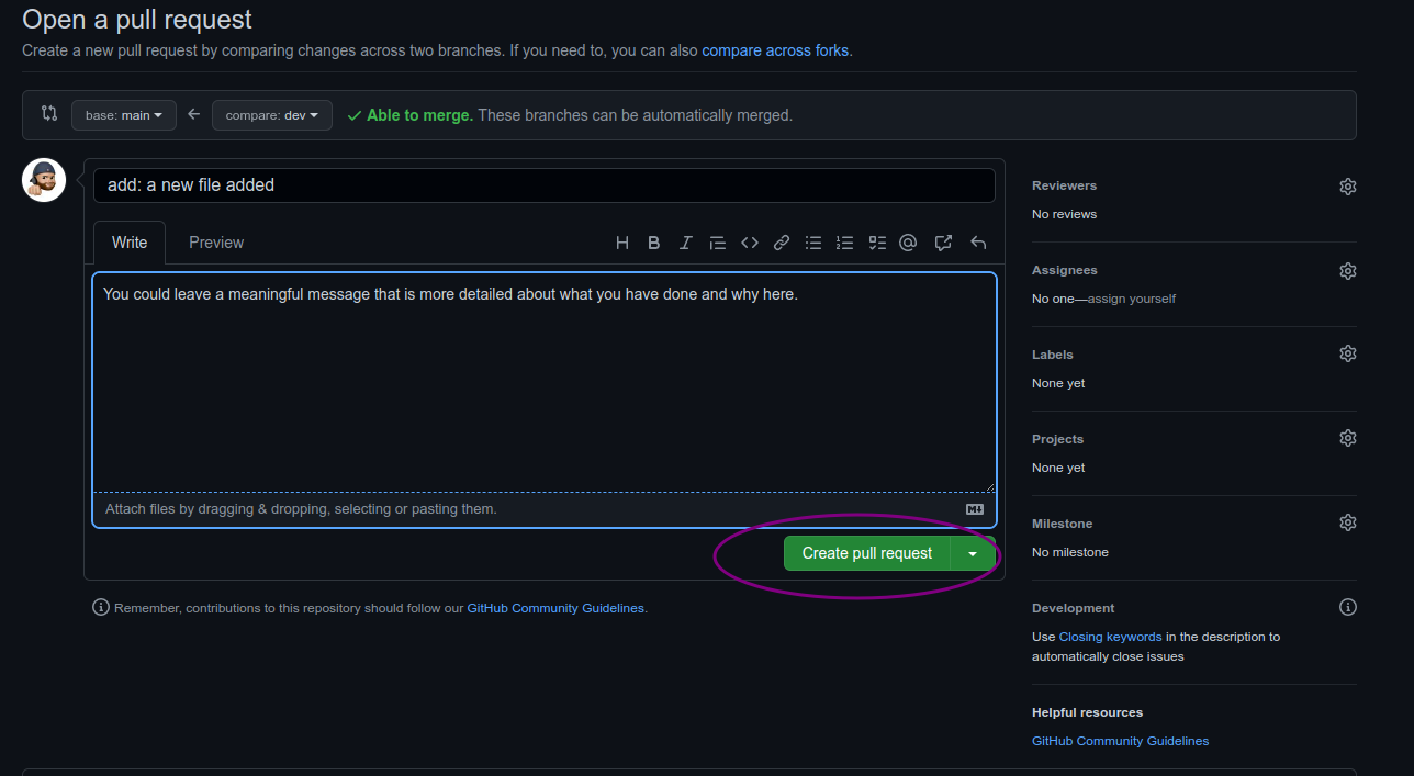 You might see a big green button at the bottom that says 'Merge pull request'. Clicking this means you'll merge your changes into the primary branch..