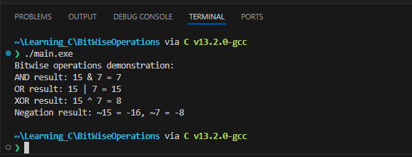 main()to look like this:int main() { // Example values for demonstration int value1 = 15; int value2 = 7; printf("Bitwise operations demonstration:\n"); bitwiseOperations(value1, value2); return 0; }The