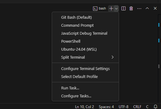 If you do not have bash as the default, you can select it from the drop down arrow, like below.