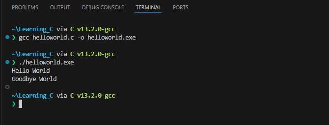 #include <stdio.h> // we need this library to get access to the input and out put methods for printing to terminal int main() { printf("Hello World\n"); // lets say hello, where it all began... printf("Goodbye World\n"); // this seems fitting as the program will close after this. return 0; // returns 0 to the int of main() and terminate the program }Some explanation about the above code: