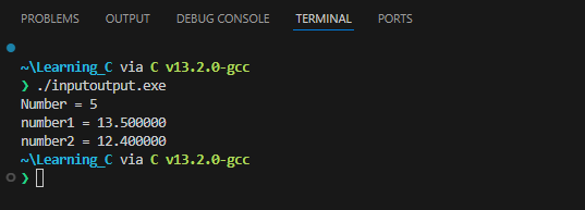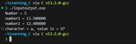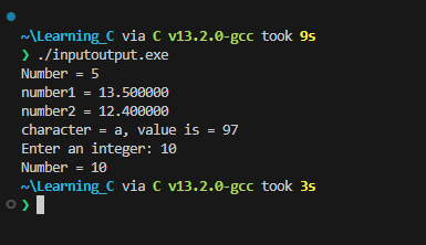 #include <stdio.h> int main() { int testInteger = 5; printf("Number = %d", testInteger); float number1 = 13.5; double number2 = 12.4; printf("number1 = %f\n", number1); printf("number2 = %lf\n", number2); char chr = 'a'; printf("character = %c, value is = %d\n", chr, chr); // note the \n for newline testInteger; printf("Enter an integer: "); scanf("%d", &testInteger); printf("Number = %d",testInteger); return 0; } -