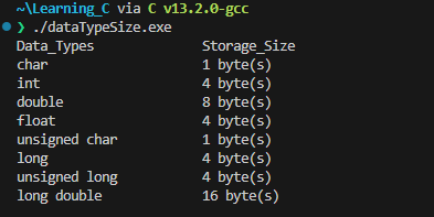 c, modify the program to look like below:#include<stdio.h> int main(){ printf("Data_Types\t\tStorage_Size \n"); printf("char\t\t\t%d byte(s) \n", sizeof(char)); printf("int\t\t\t%d byte(s) \n", sizeof(int)); printf("double\t\t\t%d byte(s) \n", sizeof(double)); printf("float\t\t\t%d byte(s) \n", sizeof(float)); printf("unsigned char\t\t%ld byte(s) \n", sizeof(unsigned char)); printf("long\t\t\t%d byte(s) \n", sizeof(long)); printf("unsigned long\t\t%ld byte(s) \n", sizeof(unsigned long)); printf("long double\t\t%ld byte(s) \n", sizeof(long double)); return 0; } -