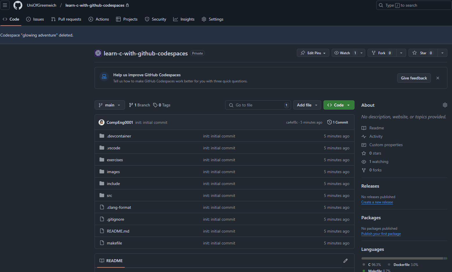 Go to the following github link and fork then open a code space and start learning to use the comipler to debug: https://github.com/UniOfGreenwich/learn-c-with-github-codespaces