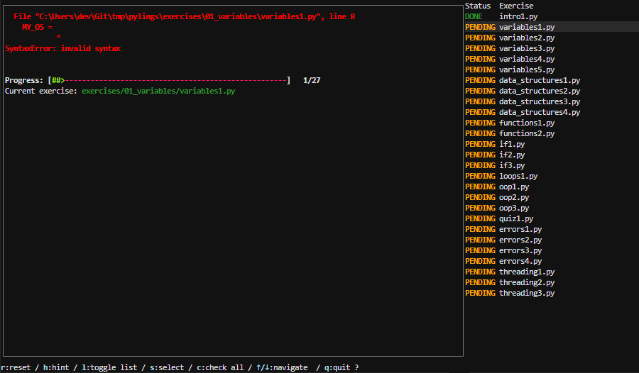 Pylings is designed to help beginners and experienced developers alike improve their Python skills through hands-on practice. Each exercise covers core Python concepts such as variables, data structures, loops, and more. This includes reading and responding to compiler and interpreter messages!