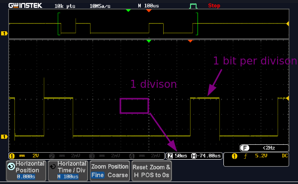 You should now see the transmitted data flashing intermittently. Press the run/stop button to capture the signal. Adjust if needed the scale and position controls to place signal to the centre of the screen.